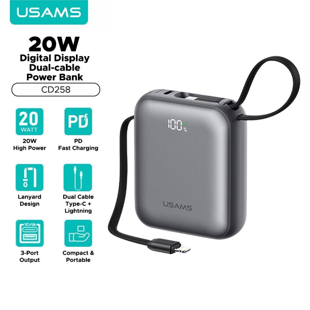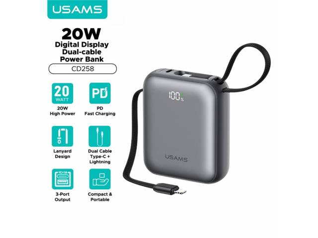 En stock En stock Power Bank 10000mAh 35W cCable Tipo C y Lightning Display Digital Gris CD261 - PB86 USAMS Cód.ACC020285