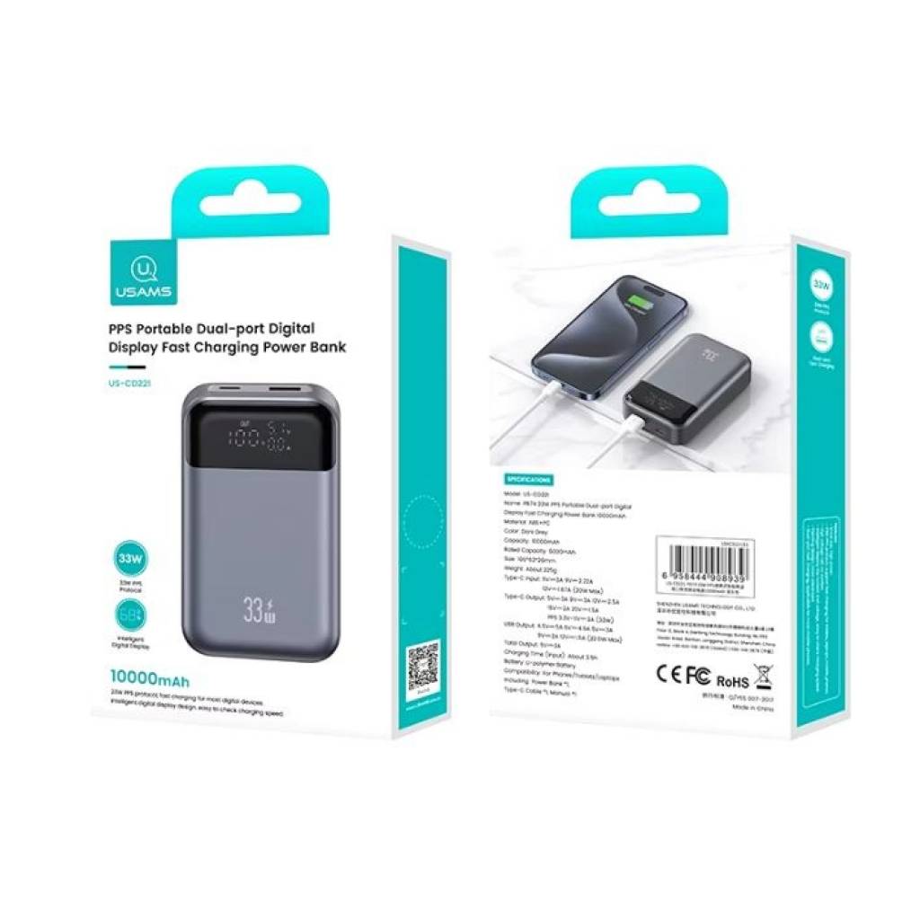 Power Bank Dual Port 10.000mAh 33W c/Display Gris CD221 USAMS